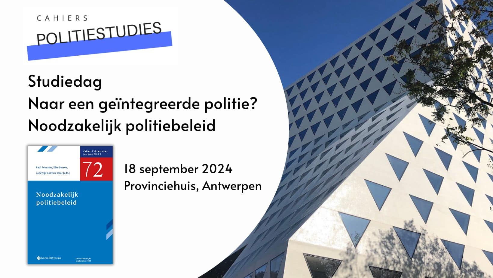 De Cahiers Politiestudies, Binnenlandse Zaken (Veiligheid en Preventie), provincie Antwerpen en de universiteit Gent organiseren samen een studiedag ‘noodzakelijk politiebeleid’. Deze dag blikt vooruit naar de toekomst. Na de intensieve samenwerking tussen een aantal politie-experten afgelopen jaar, plukken we nu de vruchten van al dat denkwerk. Aanleiding was de Staten-Generaal van mei 2022. Heel concreet wordt het Cahier Politiestudies ‘Naar een geïntegreerde politie? Noodzakelijk politiebeleid’ aan u voorgesteld. Waar moeten we nu met de politie naar toe? Bijdragen …